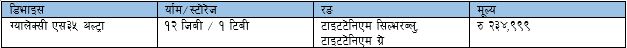 सामसङ हुलास फिनसर्भ हायर पर्चेजद्वारा उपलब्ध गरिएको इन्स्टा फाइनान्स सुविधा मार्फत ग्राहकहरूले सजिलो किस्ताबन्दी योजनाको साथ ०% ब्याजमा ग्यल्केसी एस२५ अल्ट्रा १ टिबी मासिक रु ११,७५० इएमआई सम्मबाट प्राप्त गर्न सकिनेछ। यस प्रक्रियाका लागि नागरिकता मात्र पर्याप्त हुनेछ । साथै, एनएलजी इन्स्योरेन्स कम्पनी लिमिटेड मार्फत १ वर्षको १ पटकको ब्रेकिज इन्सुरेन्स पनि दिइनेछ। पुराना फोन साटेर नयाँ ग्यालेक्सी एस२५ सिरिजको स्मार्टफोन खरिद गर्न चाहनेहरूका लागि सबकोफोन र आर्कोस्टोरबाट एक्सचेन्ज सुविधा पनि उपलब्ध छ।