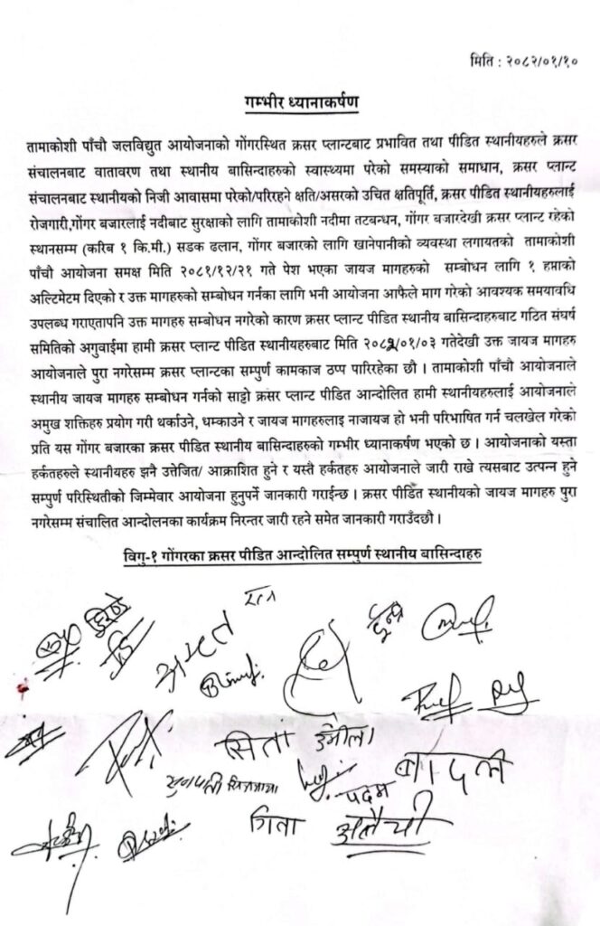 विज्ञप्तिमा भनिएको छ, ‘तामाकोशी पाँचौं आयोजनाले स्थानीयका यथार्थ र न्यायोचित मागहरू सम्बोधन गर्नुको सट्टा क्रसर पीडित स्थानीयहरूलाई धम्की दिने, दबाब सिर्जना गर्ने, र हाम्रो आन्दोलनलाई बदनाम गर्न प्रयत्न गरिरहेको प्रति गम्भीर ध्यानाकर्षण भएको छ।’ उनीहरूका अनुसार आयोजना सञ्चालनमा रहेको क्रसर प्लान्टले वातावरणीय क्षति पुर्याउनुका साथै जनस्वास्थ्यमा पनि प्रतिकूल असर पुर्याइरहेको छ।