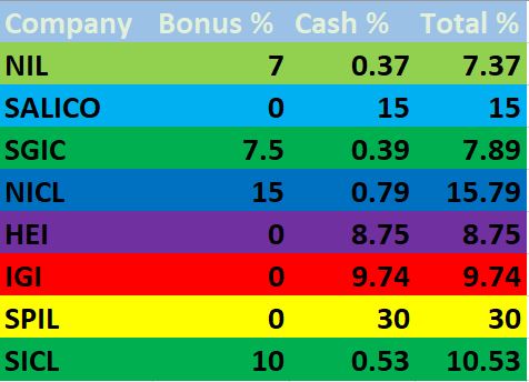 सानिमा जीआईसी इन्स्योरेन्सले ७.५ प्रतिशत बोनस र ३९ प्रतिशत नगद लाभांश, हिमालयन एभरेष्ट इन्स्योरेन्सले ८.७५ प्रतिशत नगद लाभांश, आईजीआई प्रोडेन्टियल इन्स्योरेन्स ९.७४ प्रतिशत नगद लाभांश र शिखर इन्स्योरेन्सले १० प्रतिशत बोनस शेयर र ०.५३ प्रतिशत नगद लाभांश दिएको छ ।