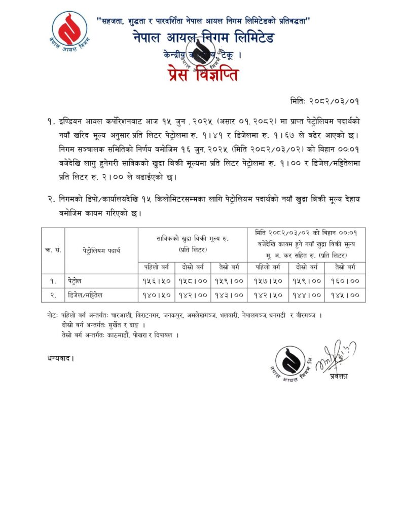 निगमका अनुसार, इन्डियन आयल कर्पोरेसनले पठाएको पछिल्लो मूल्य सूचीअनुसार डिजेलमा १ रुपैयाँ ६७ पैसा र र पेट्रोल १ रुपैयाँ ४१ पैसा बढेर आएको छ । सोही सूची अनुसार निगमले पेट्रोलियम पदार्थको मूल्य समायोजन गरेको हो ।