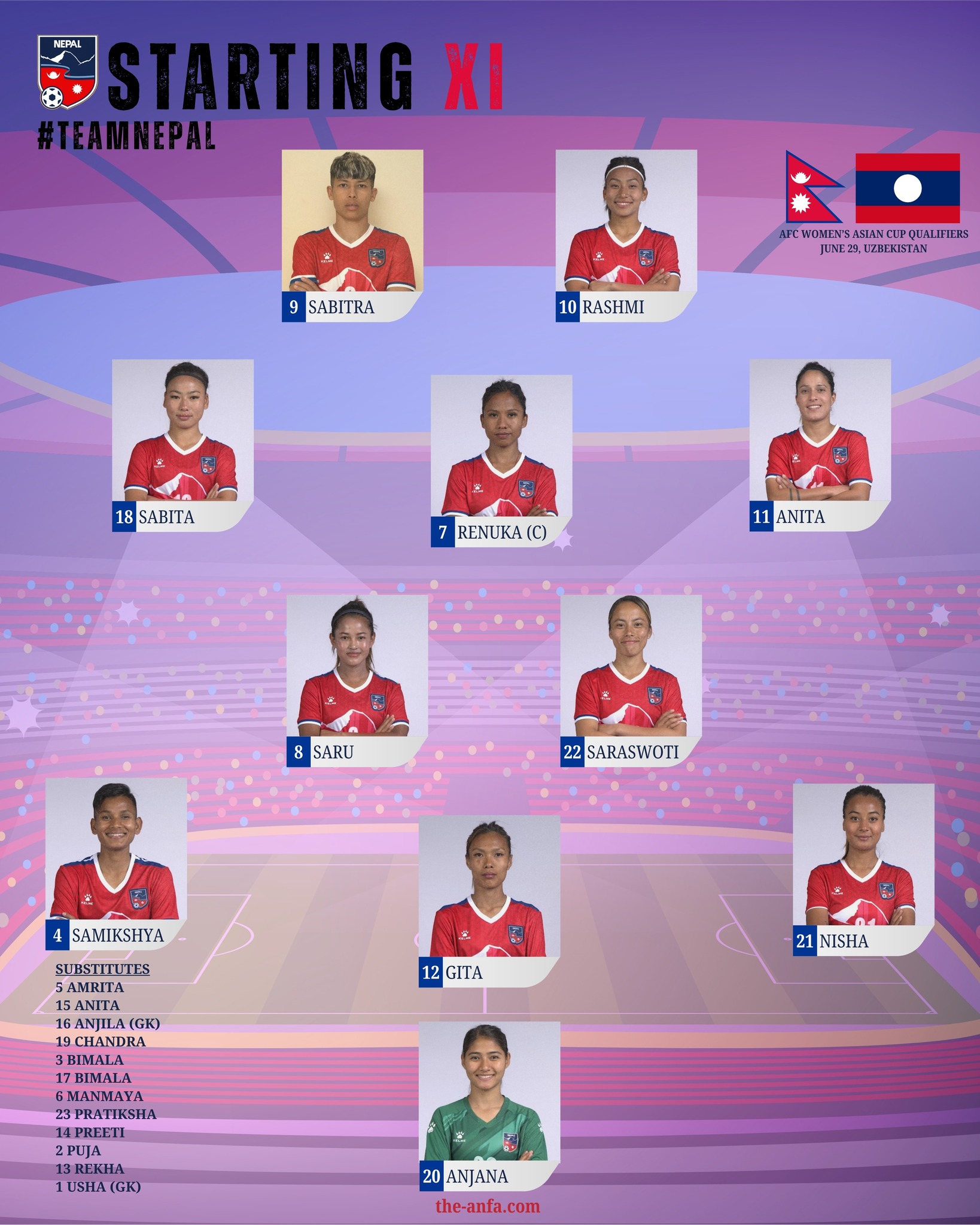 लाओस विरुद्ध नेपाली नेपालको सुरुवाती ११ मा अन्जना राना मगर, निशा थोकर, पूजा राना, समिक्षा घिमिरे, सरु लिम्बू, सरस्वती हमाल, रेनुका, सविता राना मगर, अनिता बस्नेत, रश्मिकुमारी घिसिङ र रेनुका नगरकोटे रहेका छन् ।