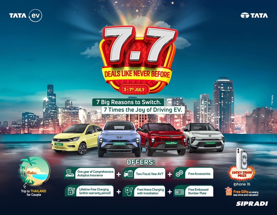 “७.७ डिल्स लाइक नेभर विफोर” कार्यक्रम अन्र्तरगत ग्राहकहरुलाई लक्षित गर्दै हरेक टाटा गाडीको खरिदमा जोडीका लागि थाइल््याण्ड भ्रमण, साथै एक वर्षको अटोप्लस बीमा, दुई आर्थिक वर्षसम्मको सवारीकर (AVT), एसेसोरिज, वारेन्टी अवधिभर चार्जिङ सेवा, चार्जिङ बक्ससहित जडान, र एम्बोस्ड नम्बर प्लेट जस्ता सुविधा निःशुल्क रुपमा प्राप्त गर्न सक्नेछन । सो अवसरमा ग्राहकहरुले नेपालभर रहेका टाटा मोटर्सको शोरुममा गई नयाँ तथा अत्याधुनिक डिजाइनका गाडीहरु अवलोकन तथा हरेक टेस्ट ड्राइभ, बुकिङ, र गाडी मूल्यांकन गर्दा ग्राहकहरूलाई आकर्षक उपहारहरू प्रदान गरिनेछ । एक जना भाग्यशाली विजेताले बम्पर पुरस्कार स्वरूप आईफोन १६ जित्ने अवसर समेत पाउनेछन ।