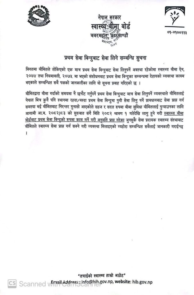 काठमाडौं । स्वास्थ्य बीमा बोर्डले बीमित नागरिकहरूलाई थप सहज र सरल बनाउने गरी प्रथम सेवा विन्दु सम्बन्धी नयाँ व्यवस्था ल्याएको छ। यो व्यवस्था २०८२ साउन १ गतेदेखि लागू हुने बोर्डले जनाएको छ।
