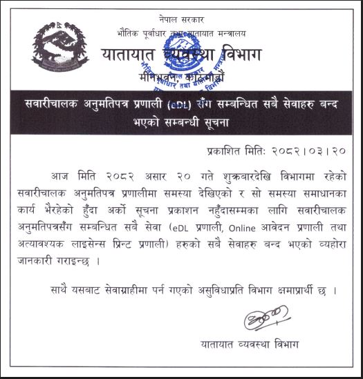 असार २० गते शुक्रबारदेखि विभागमा रहेको सवारी चालक अनुमतिपत्र प्रणालीमा समस्या देखिएको र सो समस्या समाधानका कार्य भइरहेको हुँदा अर्को सूचना प्रकाशन नहुँदासम्मका लागि सवारी चालक अनुमतिपत्रसँग सम्बन्धित सबै सेवा ‍(ईडीएल प्रणाली, अनलाइन आवेदन प्रणाली तथा अत्यावश्यक लाइसेन्स प्रणाली)हरूको सबै सेवाहरू बन्द भएको व्‍यहोरा जानकारी गराइन्छ’ सार्वजनिक सूचनामा उल्लेख छ।