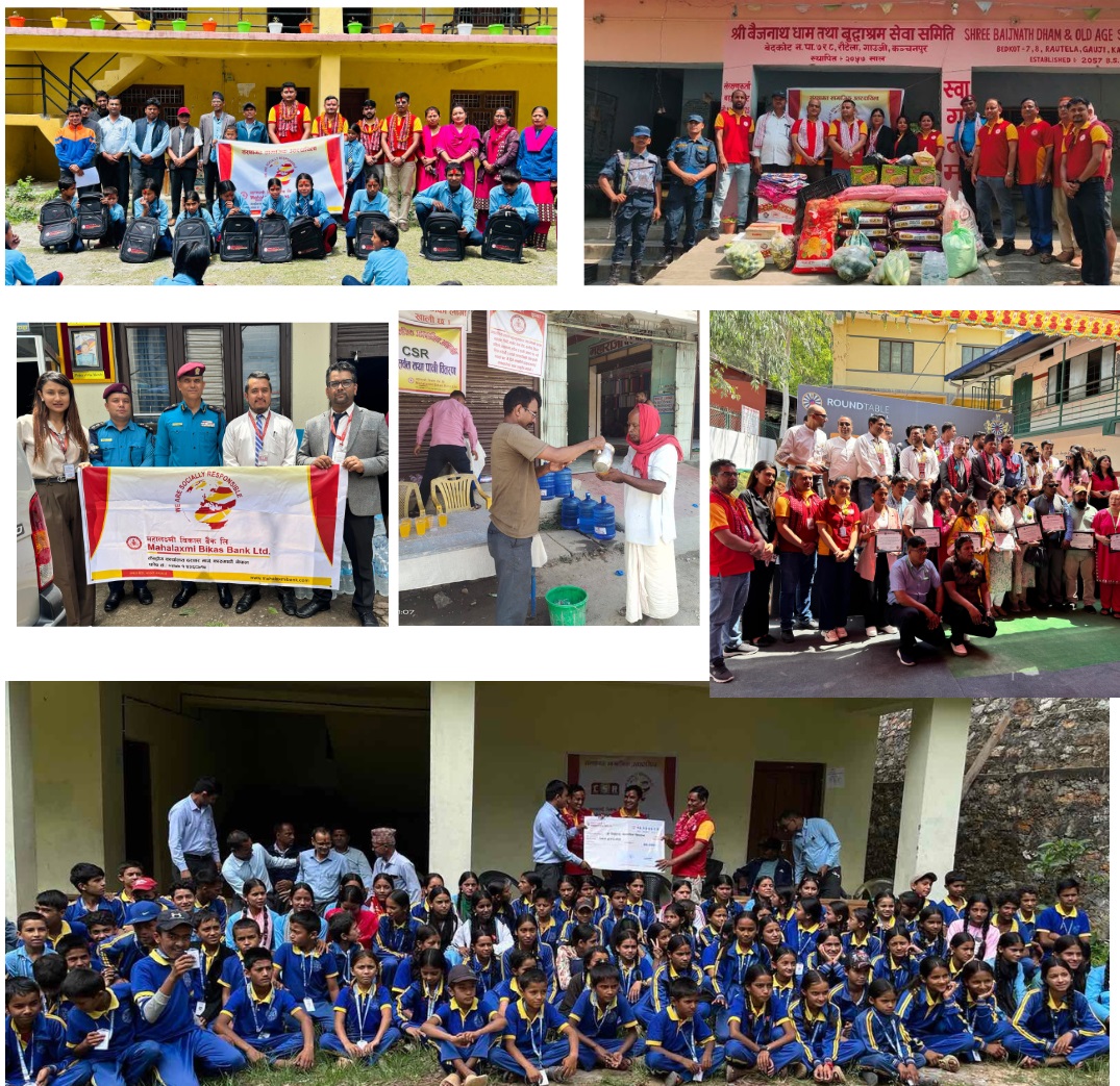 त्यसैगरी बैंकको महेन्द्रनगर शाखाले कञ्चनपुर स्थित श्री बैजनाथ धाम तथा बृद्धाश्रम सेवा समितिलाई खाद्मान्न सामाग्री प्रदान गरेको छ । साथै काठमाण्डौं जिल्ला बुढानिलकण्ठ नगरपालिका वडा नं.४ क्वाँटोल, चण्डेश्वरी स्थित श्री मदन आश्रित आदर्श माध्यामिक विद्यालयमा अध्ययनरत ११ जना विद्यार्थीहरुका लागि राउण्ड टेबल नेपालको सहकार्यमा शैक्षिक सत्र २०८२ को लागि छात्रवृति वितरण कार्यक्रम सम्पन्न गरेको छ । साथै यस बैंकको कलैया शाखाले गर्मीको समयमा उच्च तापक्रमको कारणले हुन सक्ने असजिलो कम गर्न निःशुल्क सर्वत पानी वितरण गरेको छ ।