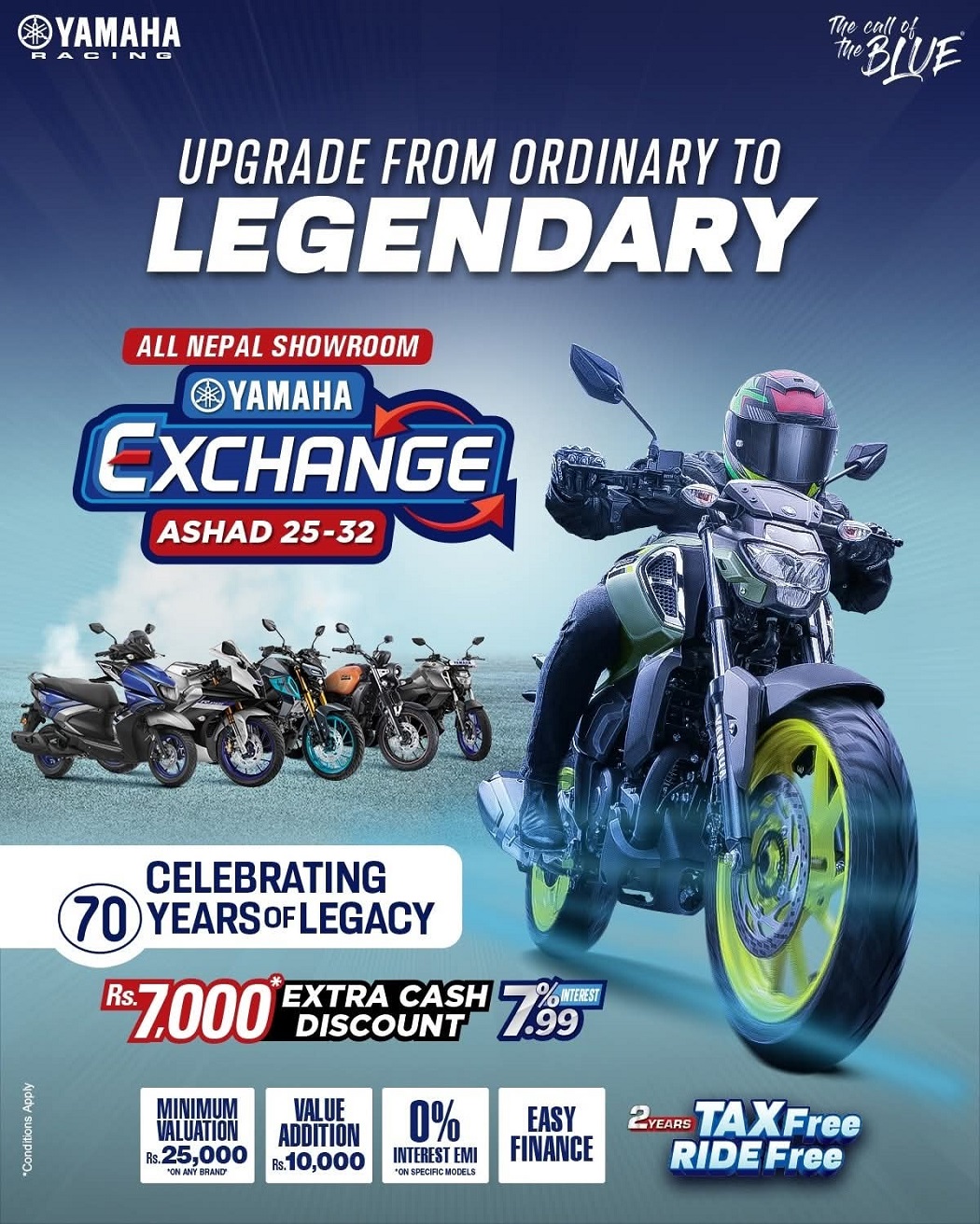 Kathmandu : Yamaha Nepal proudly marks the celebration of 70 Legendary Years of Yamaha’s global journey in innovation, style, and performance. To honor this remarkable milestone, Yamaha Nepal invites riders across the country to upgrade from ordinary to legendary with an exciting nationwide Yamaha Exchange Event, happening at all Yamaha showrooms from Ashad 25 to Ashad 32, 2082.