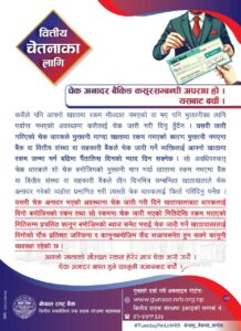 कसैले पनि आफ्नो खातामा रकम मौज्दात नभएको वा भए पनि भुक्तानीका लागि पर्याप्त नभएको अवस्थामा कसैलाई चेक जारी गर्न नहुने नेपाल राष्ट्रबैङ्कले जनाएको छ ।