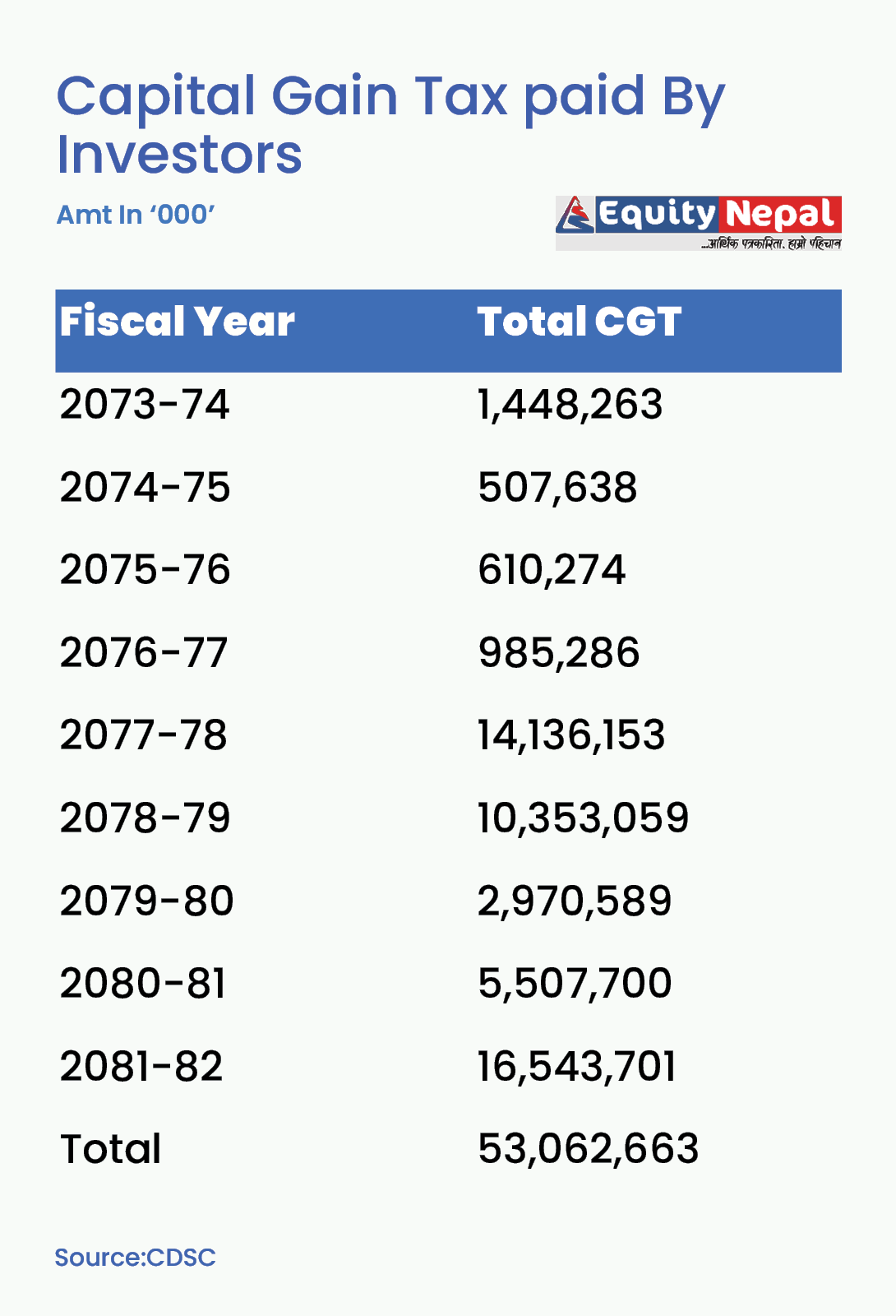 इन्भेष्टरहरुले आव २०७७-७८ मा १४ अर्ब १३ करोड, २०७८-७९ मा १० अर्ब ३५ करोड रुपैयाँ पुँजीगत लाभकर बुझाएका छन् । सीडीएस एन्ड क्लियरिङ लिमिटेडले उपलब्ध गराएको तथ्यांक अनुसार आव २०७९-८० मा लगानीकर्ताले सरकारलाई २ अर्ब ९७ करोड र २०८०-८१ मा ५ अर्ब ५० करोड रुपैयाँ पुँजीगत लाभकर बुझाएका हुन् ।