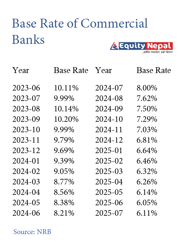 २०२३ को जुनमा बैंकहरुको बेसरेट १०.११ प्रतिशत थियो । त्यसयतादेखि उक्त दर लगातार घटेको छ । नेपाल राष्ट्र बैंकका अनुसार जुलाई २७ मा वाणिज्य बैंकहरुले ६४ खर्ब ७० अर्ब निक्षेप संकलन गरेका छन् भने ४९ खर्ब ४१ अर्ब रुपैयाँ कर्जा प्रवाह भएको छ । सीडी रेसियो ७५.९८ प्रतिशत छ । यता, समग्र बैंक तथा वित्तीय संस्थाले ७२ खर्ब २३ अर्ब निक्षेप संकलन गरेर ६४ खर्ब ७० अर्ब कर्जा प्रवाहा गरेका छन् ।