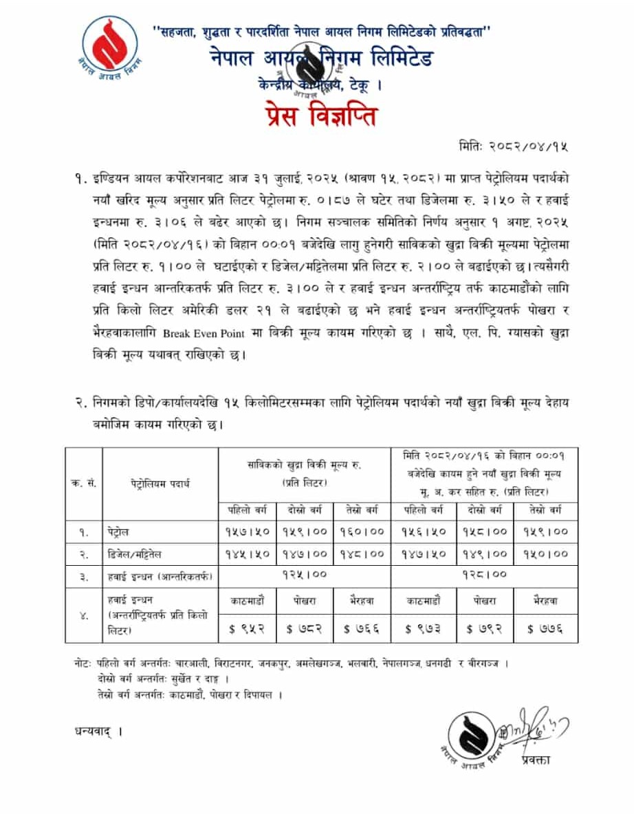 निगमका अनुसार पेट्रोलमा प्रतिलिटर १ रुपैयाँ मूल्य घटेको छ भने डिजेल र मट्टितेलमा प्रतिलिटर ३ रुपैयाँ मूल्य बढेको छ ।