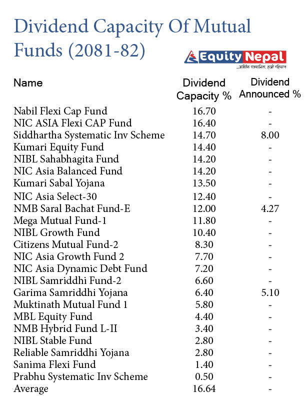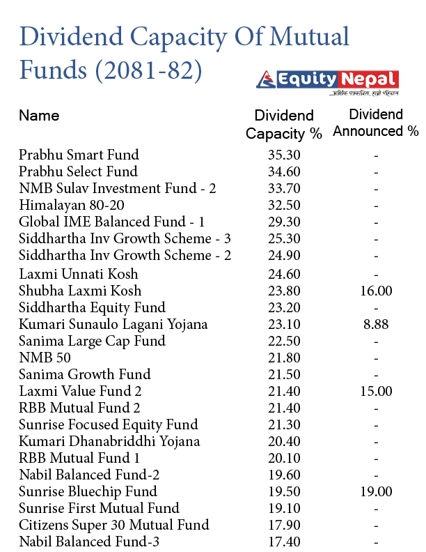 तथ्यांक अनुसार प्रभु स्मार्ट फन्डको लाभांश क्षमता ३५.३० प्रतिशत छ । त्यस्तै, प्रभु सेलेक्ट फन्डको ३४.६०, एनएमबि सुलफ इन्भेषटमेन्ट फन्ड-२ को ३३.७० र हिमालयन८०-२० को लाभांश क्षमता ३२.५० प्रतिशत छ । १९ वटाको लाभांश क्षमता २० प्रतिशत भन्दा धेरै छ ।