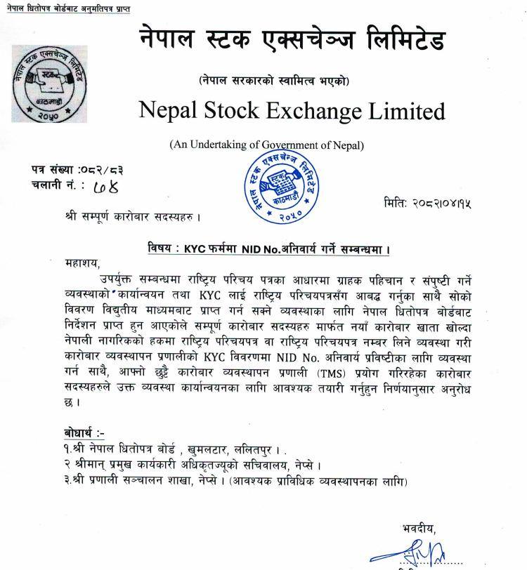 काठमाडौं । सेयर कारोबारका लागि नयाँ खाता खोल्न राष्ट्रिय परिचय पत्र अनिवार्य रुपमा चाहिने भएको छ । नेपाल स्टक एक्सचेन्जले सूचना जारी गर्दै नयाँ कारोबार खाता खोल्दा राष्ट्रिय परिचय पत्र नम्बर अनिवार्य गर्न ब्रोकर कम्पनीहरूलाई पत्राचार गरेको छ । आफ्नै कारोबार प्रणाली (टिएमएस) प्रयोग गरिरहेका ब्रोकरहरूलाई भने यसको लागि तयारी गर्न समेत नेप्सेले निर्देशन दिएको छ।