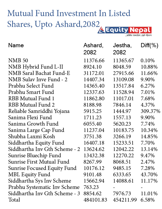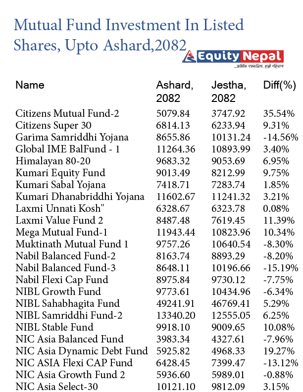 तथ्यांक अनुसार असारसम्म सूचीकृत सेयरमा सबैभन्दा ठूलो लगानी एनआइबिएल सहभागिता फन्डको देखिएको छ । यसको बजारमा ४ अर्ब ९२ करोड लगानी छ । त्यस्तै, एनएमबि सरल बचत फन्ड-इ को ३ अर्ब ११ करोड रुपैयाँ लगानी देखिएको छ । यसअवधिसम्म १८ वटा फन्डको सूचीकृत कम्पनीको सेयरमा १ अर्ब भन्दा धेरैको लगानी देखिएको छ ।