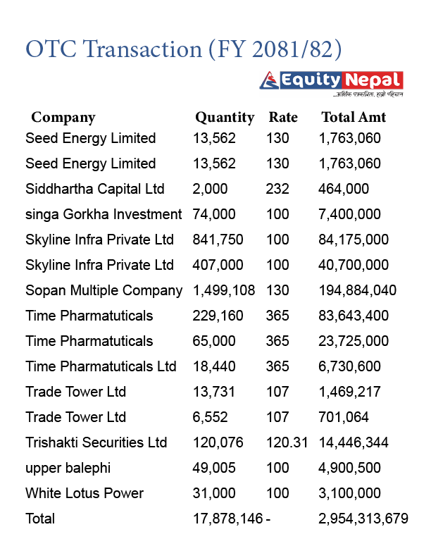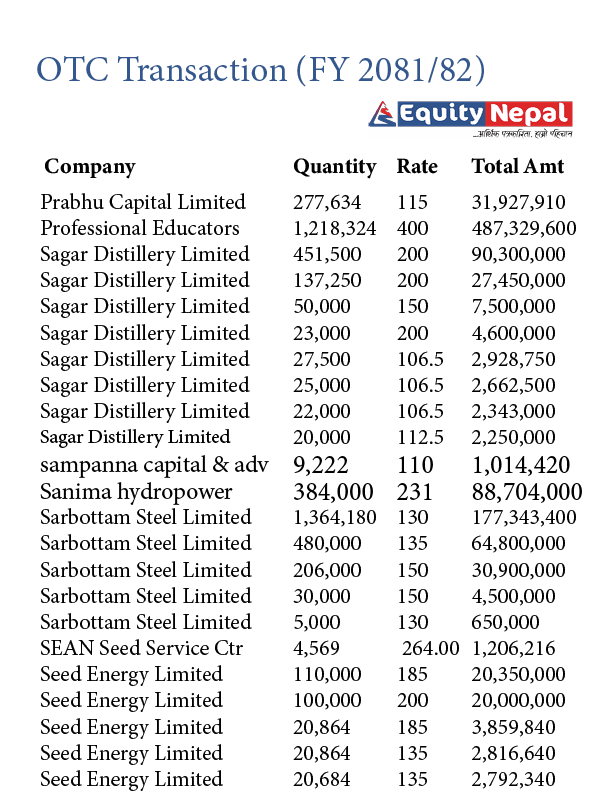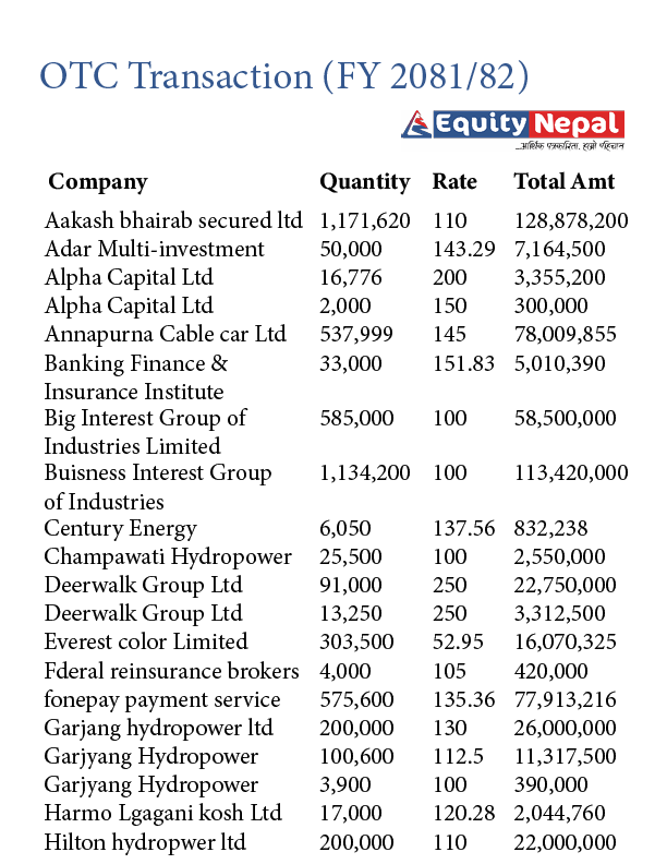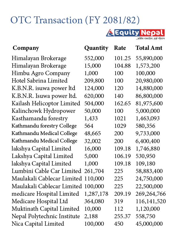 गत वर्ष ४९ वटा कम्पनीको ८१ पटक विभिन्न मितिमा ओटीसी मार्केटबाट सेयर कारोबार भएको छ । कुल १ करोड ७८ लाख ७८ हजार कित्ता सेयर कारोबार भएको देखिन्छ । ओटीसीमा खरिदबिक्री भएका धेरै जसो कम्पनीहरु आइपीओ बिक्रीको तयारीमा छन् ।