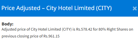 काठमाडौं । नेपाल स्टक एक्सचेन्ज (नेप्से)मा सिटी होटल लिमिटेडको ८० प्रतिशत हकप्रद सेयरमा मूल्य समायोजन भएको छ । सोमबारको अन्तिम कारोबार मूल्य ९६१.१५ रुपैयाँलाई आधार मानेर भाउ समायोजन गरिएको हो । समायोजन पश्चात यसको मूल्य ५७८.४२ रुपैयाँ कायम भएको छ । सोही भाउलाई आधार मानेर यसको कारोबार खुला हुनेछ ।