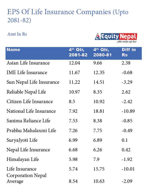 प्रतिसेयर आम्दानी एसियन लाइफको सबैभन्दा धेरै छ । यसको उक्त आम्दानी १२.०४ रुपैयाँ छ । औसतमा बिमाहरुको इपीएस ८.५४ रुपैयाँ छ ।