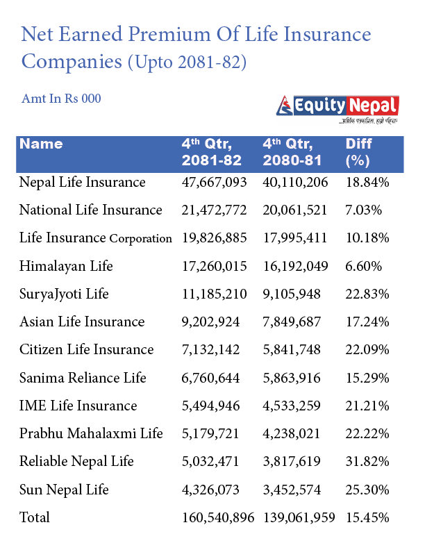 नेपाल लाइफले सबैभन्दा धैरै ४७ अर्ब ६६ करोड रुपैयाँ बराबको बिमा शुल्क संकलन गरेको छ । यो अघिल्लो वर्षको भन्दा १८.८४ प्रतिशत धेरै हो । ५ वटा बिमा कम्पनीहरुको उक्त शुल्क संकलन १० अर्ब भन्दा धेरै छ । समग्रमा सूचीकृत बिमा कम्पनीहरुले १ खर्ब ६० अर्ब रुपैयाँ भन्दा धेरैको बिमा शुल्क संकलन गरेका छन् ।
