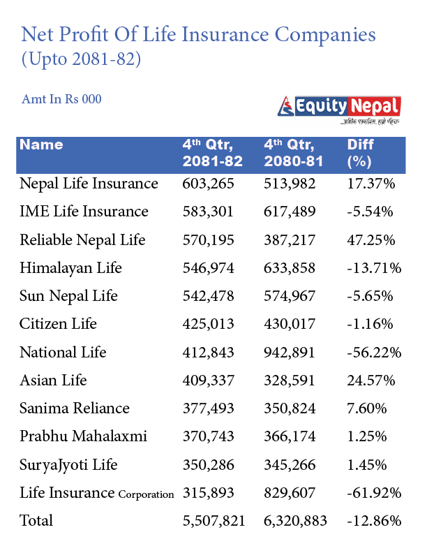 १२ जीवन बिमामध्ये सबैभन्दा धेरै नाफा कमाउनेमा नेपाल लाइफ अगाडि छ । यसले गत असारसम्म ६० करोड ३२ लाख रुपैयाँ नाफा आर्जन गरेको छ । यो अघिल्लो वर्षको सोही अवधिको तुलनामा १७.३७ प्रतिशत धेरै हो । बिमाहरुले समग्रमा ५ अर्ब ५० करोड नाफा कमाएका छन् ।