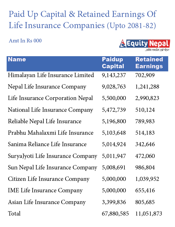 सूचीकृत १२ जीवन बिमा कम्पनीमध्ये हिमालयन लाइफको चुक्ता पुँजी सबैभन्दा धेरै ९ अर्ब १४ करोड ३२ लाख रपैयाँ बराबर रहेको छ । दोस्रोमा, नेपाल लाइफको पुँजी ९ अर्ब २ करोड रहेको छ ।