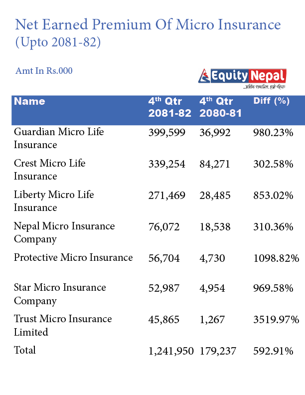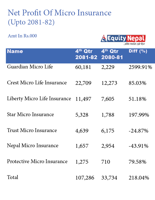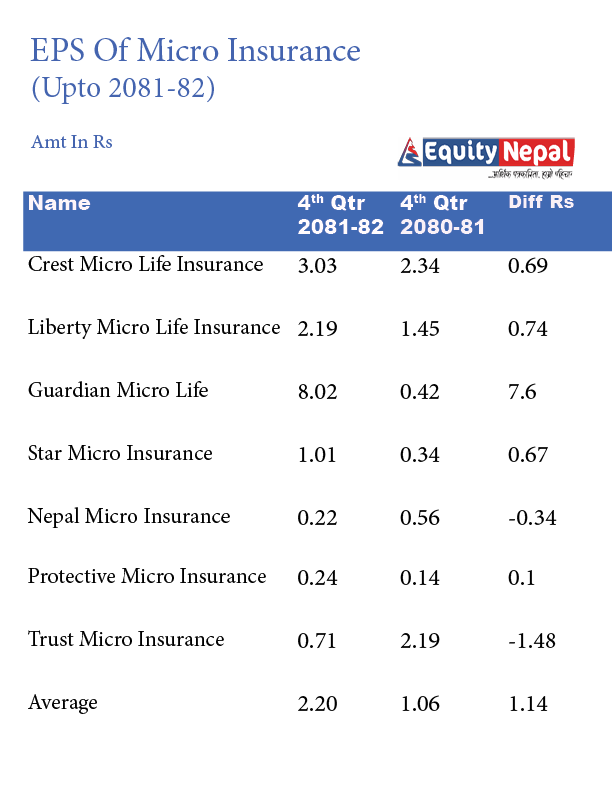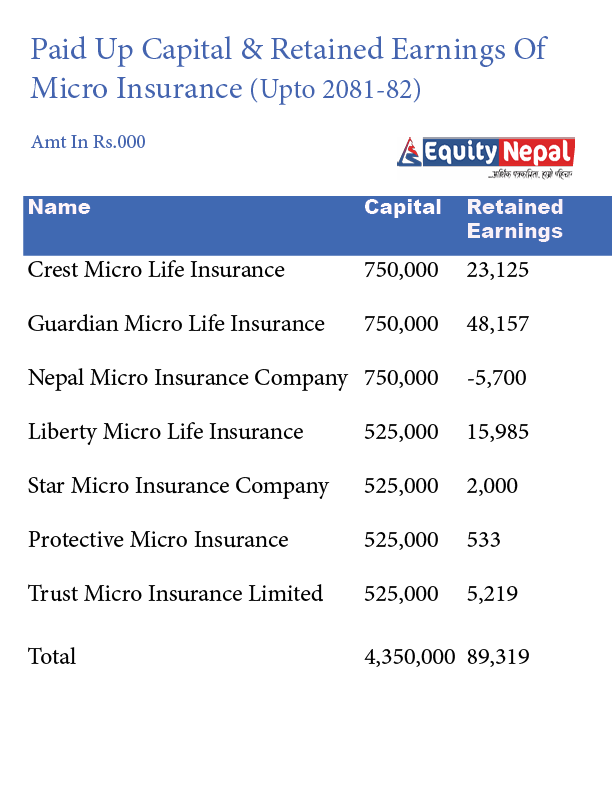 जीवन र निर्जीवन लघु बिमाहरुको चुक्ता पुँजी ४ अर्ब ३५ करोड पुगेको छ । जसमध्ये ३ वटाको पुँजी ७५ करोड रुपैयाँ बराबर रहेको छ । अरुको पुँजी ५२ करोड ५० लाख बराबर छ । यता, रिटेन्ड अर्निङमा गार्डियन माइक्रो लाइफको सबैभन्दा धेरै ४ करोड ८१ लाख रुपायँ रहेको जम्मा छ । समग्रमा बिमाहरुको रिटेन्ड अर्निङमा ८ करोड ९३ लाख रुपैयाँ जम्मा रहेको छ ।