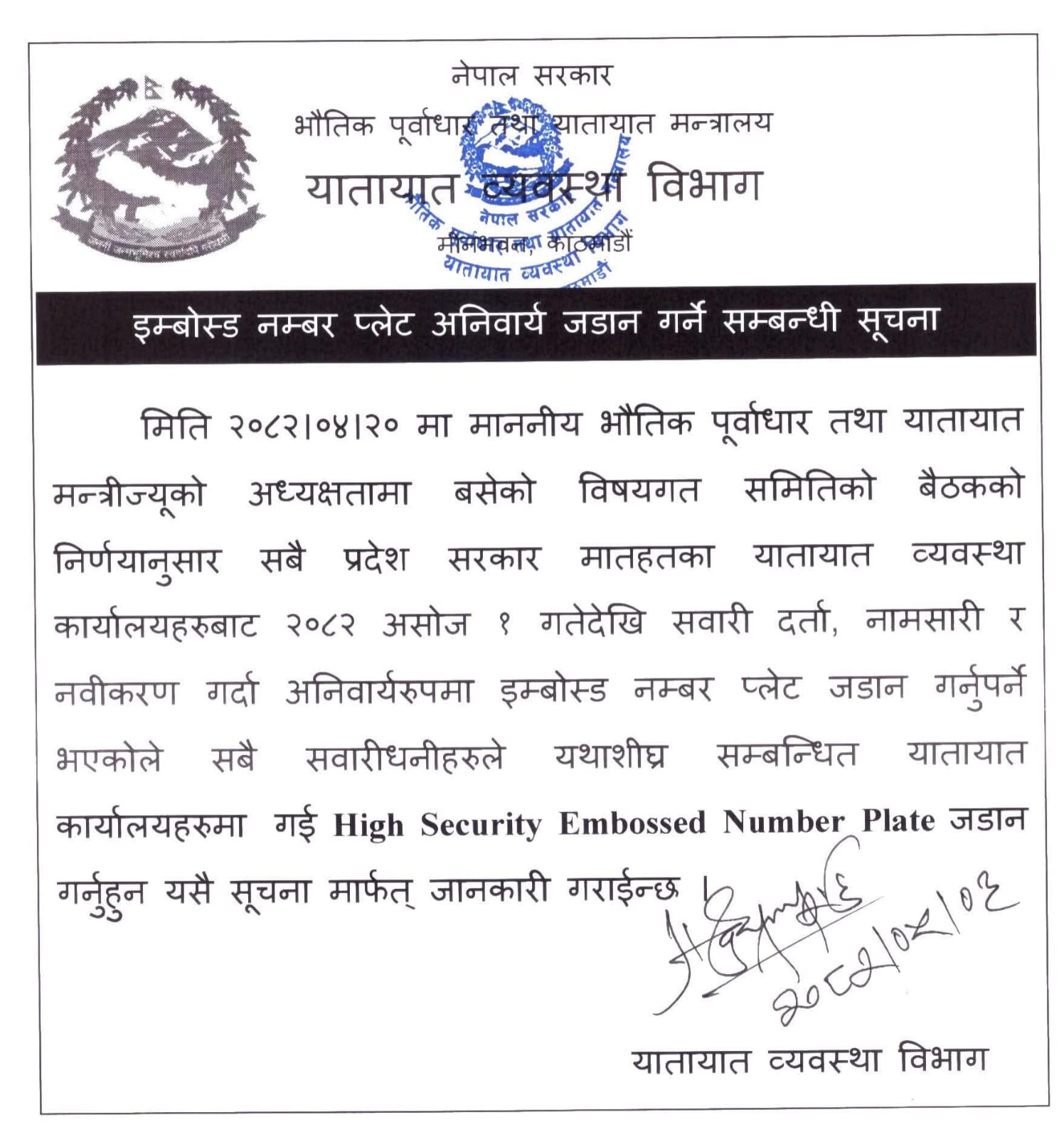 मन्त्रालयले सबै सबारीधनीलाई  यथाशीघ्र सम्बन्धित यातायात कार्यालयहरुमा गई High Security Embossed Number Plate जडान गर्न भनेको छ   ।