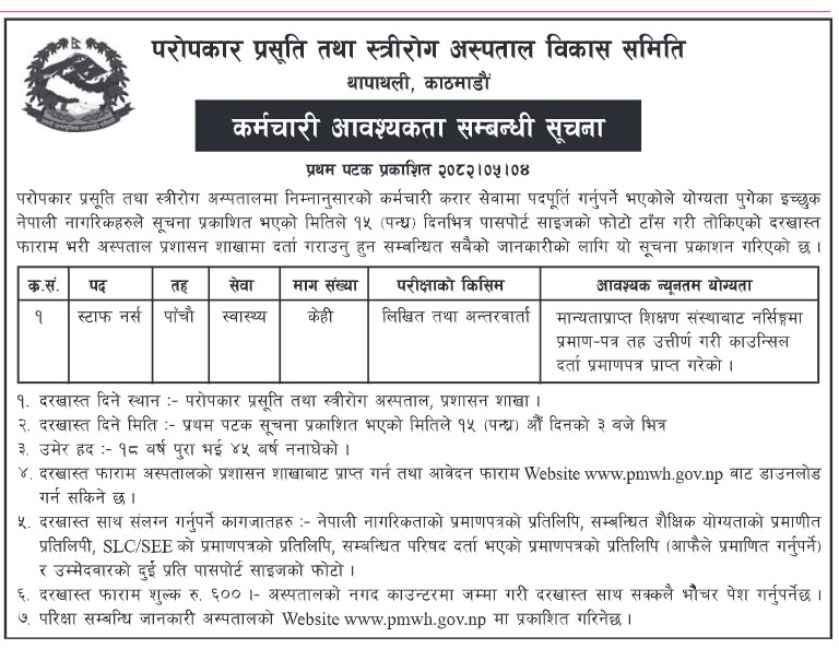 काठमाडौं । काठमाडौँको थापाथलीस्थित परोपकार प्रसूति तथा स्त्रीरोग अस्पताल (प्रसूति गृह) ले करार सेवामा स्टाफ नर्स पदका लागि दरखास्त माग गरेको छ। अस्पताल प्रशासनले आज १ सूचना प्रकाशन गर्दै स्वास्थ्य सेवातर्फ पाँचौँ तहमा केही संख्यामा स्टाफ नर्स माग गरेको हो । अस्पतालले आबेदन माग गरेकोमा के कति संख्या भने खुलाएको छैन।