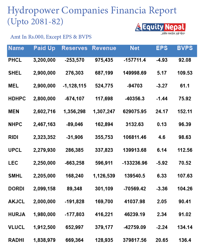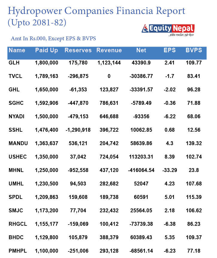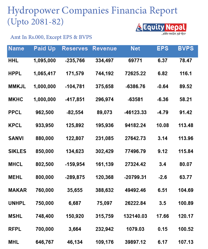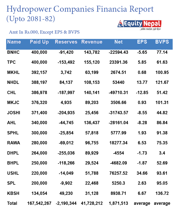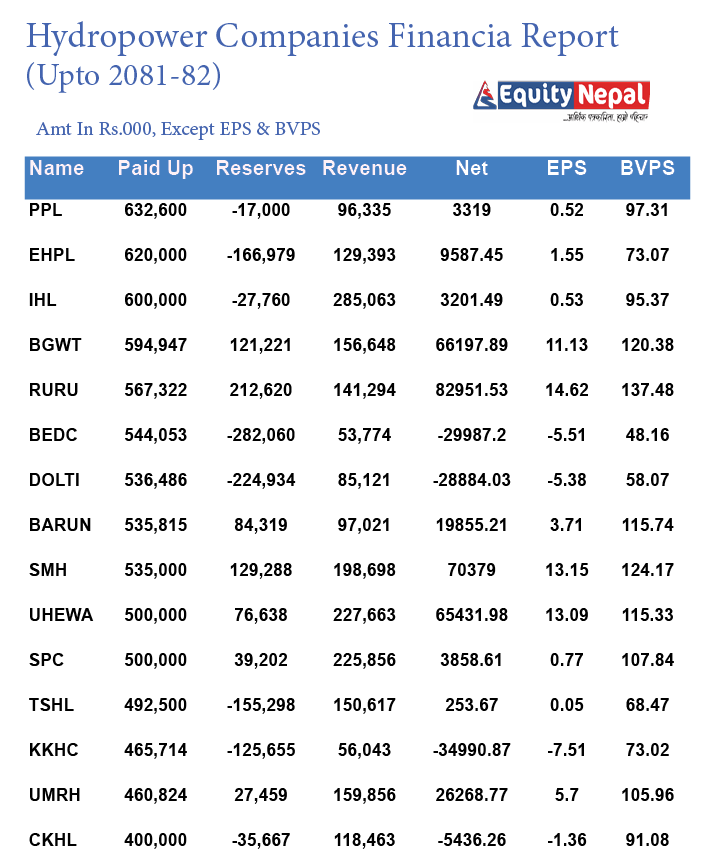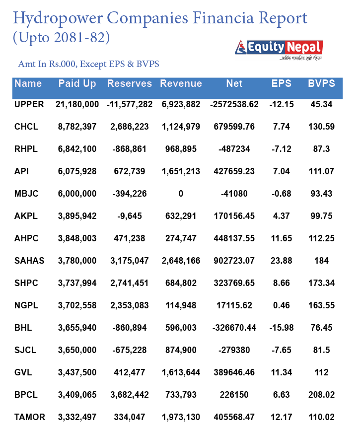 हाइड्रोपावर कम्पनीहरुको चुक्ता पुँजी १ खर्ब ६७ अर्ब ५४ करोड भन्दा धेरै छ । सबैभन्दा धेरै पुँजी अपर तामाकोशीको रहेको छ । यसको २१ अर्ब १८ करोड रुपैयाँ बराबरको पुँजी छ । सबैभन्दा कम पुँजी कुथेली बखरीको १३ करोड ४० लाख रुपैयाँ बराबरको छ ।