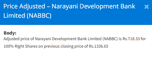 काठमाडौं । नारायणी डेभलपमेन्ट बैंकको १०० प्रतिशत हकप्रद सेयरमा मूल्य समायोजन भएको छ । आइतबारको ‘क्लोजिङ प्राइस’ १३३६.६५ रुपैयाँलाई आधार बनाएर भाउ समायोजन गरिएको हो । समायोजन पश्चात बैंकको सेयर मूल्य ७१८.३३ रुपैयाँ कायम भएको छ । सोही भाउलाई आधार बनाएर सोमबार यसको कारोबार खुला हुनेछ ।