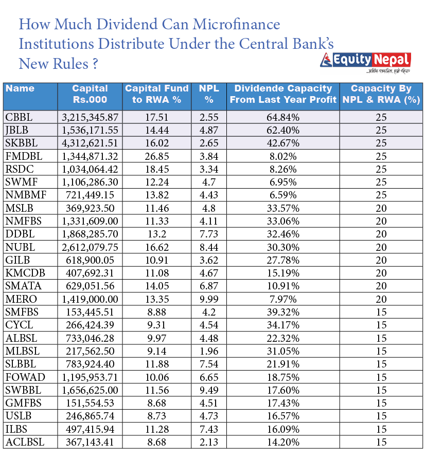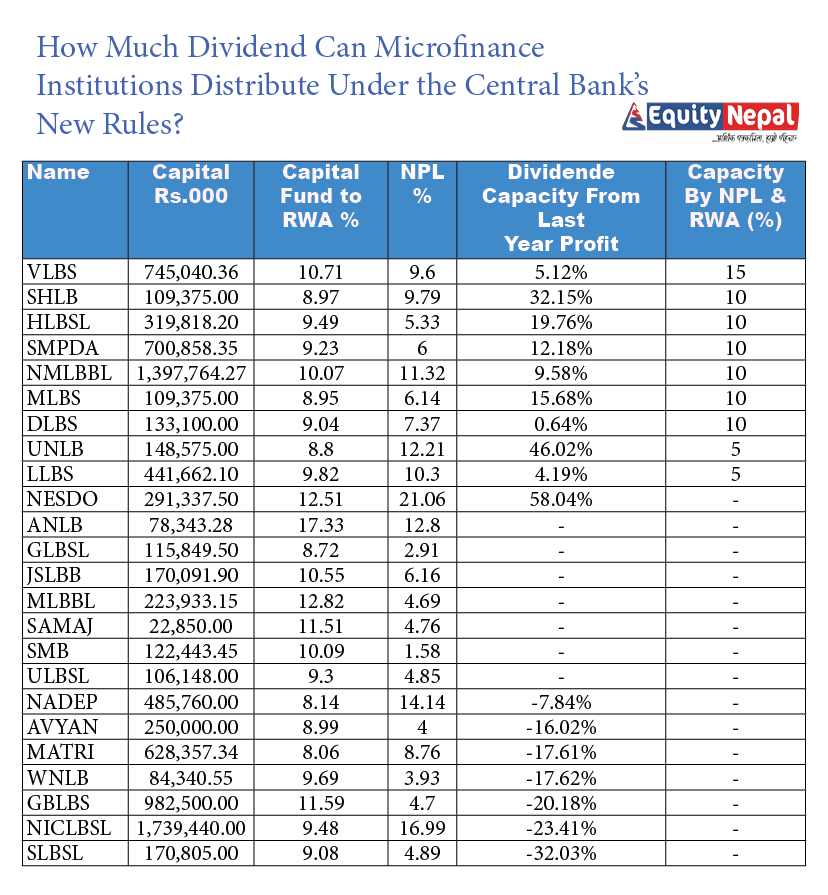 यता, ८ वटा संस्थाले भने २० प्रतिशतसम्म लाभांश वितरण गर्न पाउँछन् । त्यसमध्ये ५ वटाको मात्र लाभांश क्षमात २० प्रतिशत भन्दा माथि छ । निर्धन उत्थान, ग्लोबल आइएमई, डेप्रोक्स, नेसनल लघुवित्त र महुली लघुवित्तलगायतका संस्थाले भने २० प्रतिशतसम्म लाभांश दिन सक्छन् । यी ८ मध्ये ३ वटाको लाभाशं क्षमता २० प्रतिशत भन्दा कम छ ।