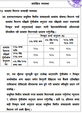 साथै, पुँजीकोष १२ प्रतिशतभन्दा माथि भएपनि निष्क्रिय कर्जा ५ देखि १० प्रतिशतसम्म भएमा २० प्रतिशत लाभांश दिने पाउने निर्देशनमा उल्लेख छ ।