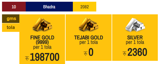 काठमाडौं । मंगलबार सुनको मूल्यमा प्रतितोला १ लाख ९८ हजार ७०० रुपैयाँमा पुगेको छ । नेपाल सुनचाँदी व्यवसायी महासंघका अनुसार सुनको भाउ १५ सय रुपैयाँ बढेको हो । सोमबार नेपाली बजारमा सुनको भाउ प्रतितोला १ लाख ९७ हजार २०० रुपैयाँमा कारोबार भएको थियो ।