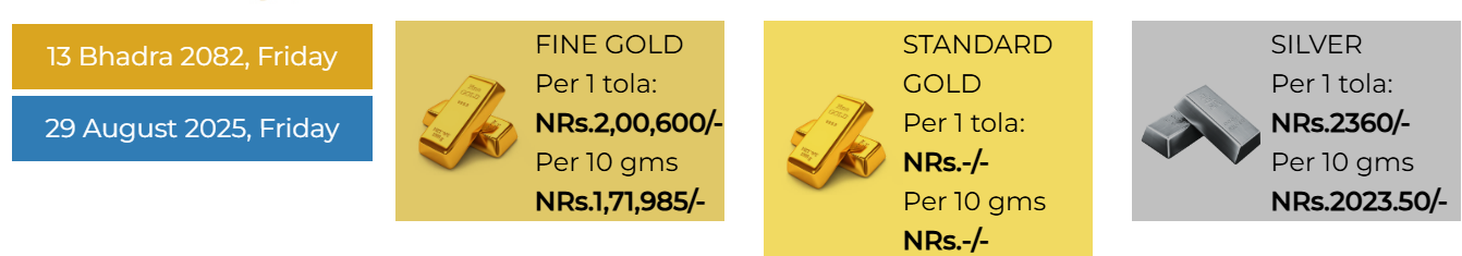 काठमाडौं । शुक्रबार सुनको भाउ प्रतितोला २ लाख नाघेको छ । सोसँगै सुनको मूल्यले रेकर्ड ब्रेक गरेको छ । नेपाल सुनचाँदी व्यवसायी महासंघका अनुसार शुक्रबार सुनको मूल्य प्रतितोला २ लाख ६०० रुपैयाँ पुगेको छ । बिहीबारको तुलनामा सुनको मूल्य तोलामा १ हजार २०० रुपैयाँ बढेको हो । शुक्रबार चाँदीको मूल्य २ हजार ३६० रुपैयाँमा कायम भएको छ ।