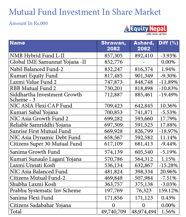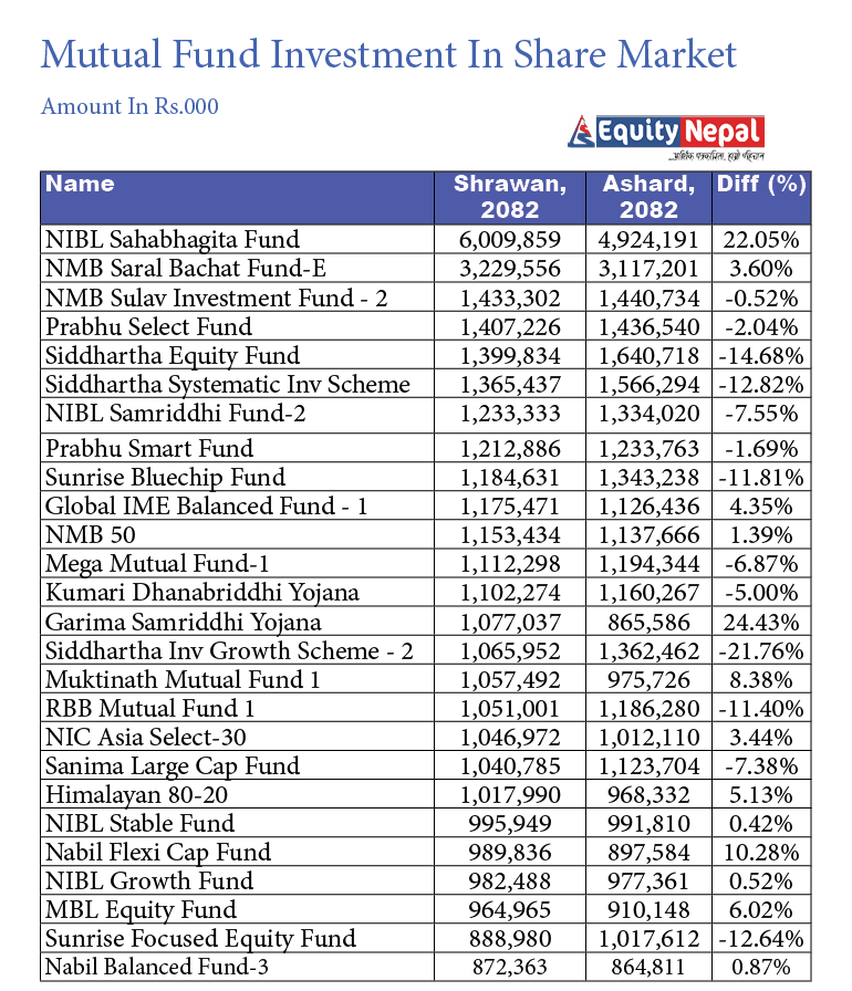 २० वटा फन्डहरुको लगानी १ अर्ब भन्दा धेरै छ । समग्रमा म्युचुअल फन्डहरुले ४९ अर्ब ७४ करोड रुपैयाँ सेयर बजारमा लगानी गरेका छन् । यो अघिल्लो महिनाको भन्दा १.५६ प्रतिशत धेरै हो । स्टक मार्केट घट्दा पनि लगानी भने बढेको छ ।