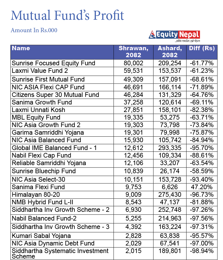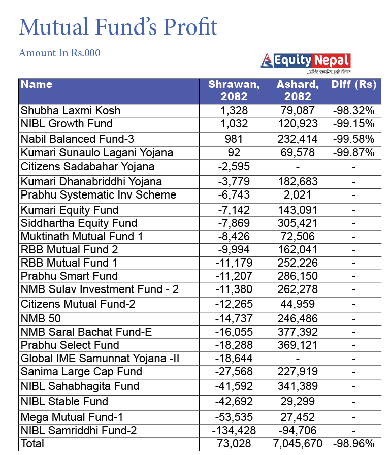 सञ्चालनमा रहेका म्युचुअल फन्डहरुले ७ करोड ३० लाख रुपैयाँ नाफा कमाएका छन् । यो अघिल्लो महिनाको भन्दा ९८.९६ प्रतिशत कम हो । अघिल्लो महिना यिनीहरुले ७ अर्ब ४ करोड नाफा आर्जन गरेका थिए । ४९ मध्ये २९ वटाले मात्र नाफा आर्जन गरेका छन् ।