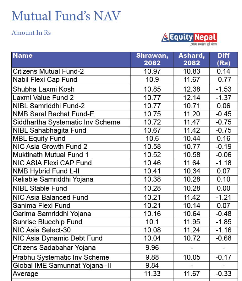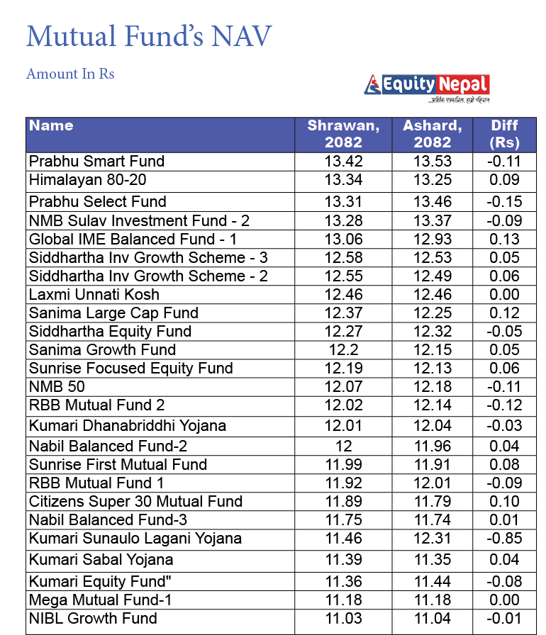 प्रभु स्मार्ट फन्डको न्याभ सबैभन्दा धेरै १३.४२ रुपैयाँ छ । त्यस्तै, हिमालयन ८०-२० को न्याभ १३.३४ रुपैयाँ छ । ४९ मध्ये ५ वटाको न्याभ १३ रुपैयाँ भन्दा धेरै छ । यता, ३ वटाको उक्त भ्याल्यू १० रुपैयाँ भन्दा कम देखिएको छ ।