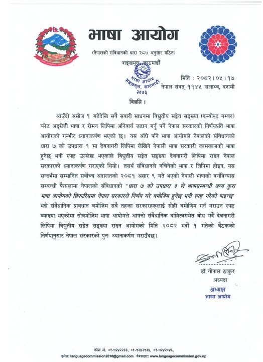 संविधानले नचिनेको भाषा र लिपीमा नभई नेपाली भाषामा नै इम्बोस्ड नम्बर प्लेट राख्नुपर्ने संवैधानिक व्यवस्था र सर्वोच्च अदालतको फैसलाको समेत आयोगले जानकारी गराएको छ ।