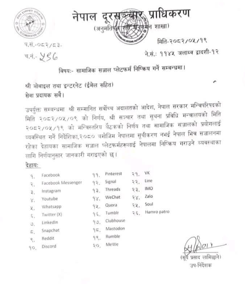 काठमाडौं । सरकारले फेसबुक,ट्वीटर (एक्स),युट्युबलगायत २६ वटा सामाजिक सञ्जाल बन्द गर्ने निर्णय गरेको छ। मन्त्रिपरिषदको निर्णय र सर्वोच्च अदालतको परमादेश कार्यान्वयन गर्नका लागि सञ्चार तथा सूचना प्रविधि मन्त्रालयले बिहीबार उक्त निर्णय गरेको हो।