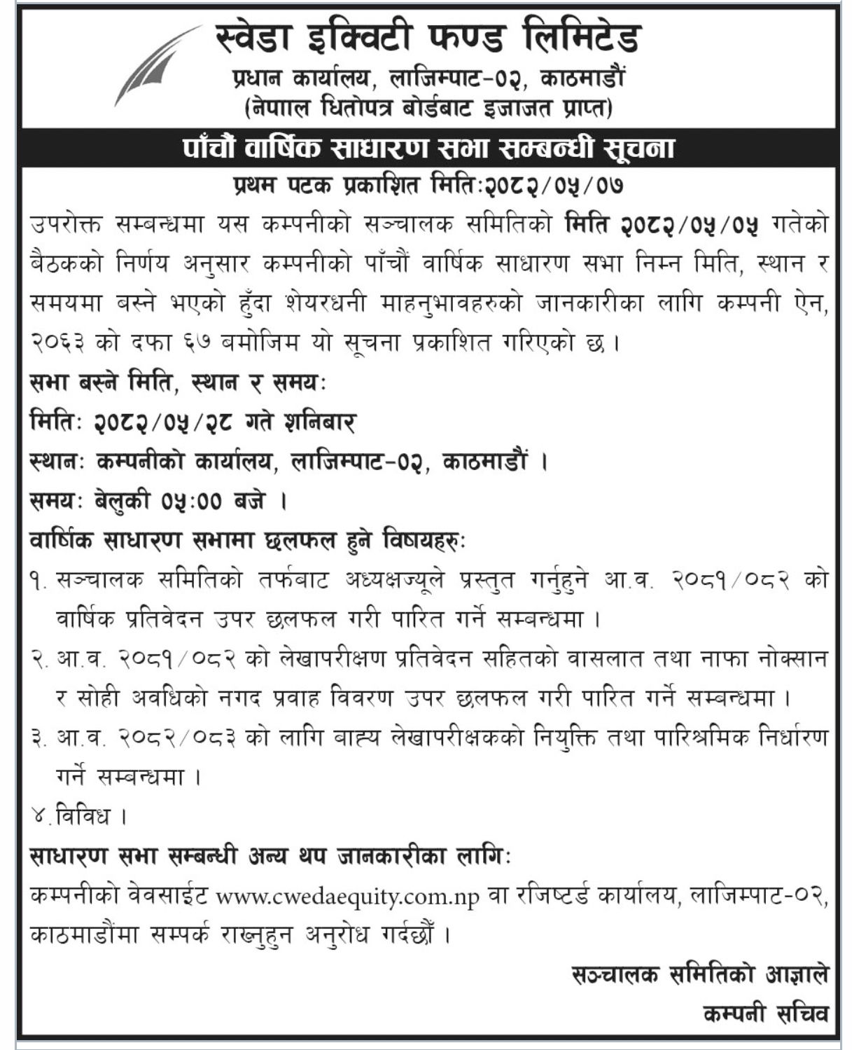काठमाडौं । स्वेडा इक्विटी फन्ड लिमिटेडले भदौ २८ गते ५ औं वार्षिक साधारण सभा बोलाएको छ । सभा कम्पनीको कार्यालय, लाजिम्पाट-२, काठमाडौंमा बेलुका ५ बजेदेखि सुरु हुनेछ । सभामा आर्थिक वर्ष २०८१-८२ को नाफा नोक्सान सम्बन्धी हिसाबका सम्बन्धमा छलफल हुनेछ । आर्थिक वर्ष २०८२–८३ का लागि लेखापरीक्षक नियुक्ति र पारिश्रमिक निर्धारण गर्नेलगायतका एजेन्डाहरु पनि सभामा पेश हुनेछन् ।