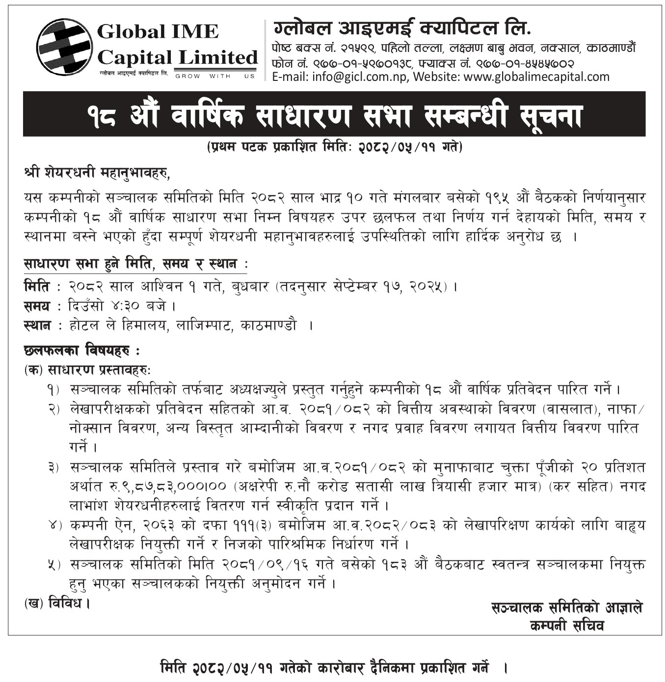 कम्पनीले सभामा लाभांश प्रस्ताव पेश गर्नछ । सभामा आर्थिक वर्ष २०८१-८२ को नाफा नोक्सान सम्बन्धी हिसाबका सम्बन्धमा छलफल हुनेछ । आर्थिक वर्ष २०८२–८३ का लागि लेखापरीक्षक नियुक्ति र पारिश्रमिक निर्धारण गर्नेलगायतका एजेन्डाहरु रहनेछन् ।