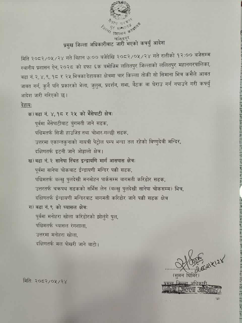 काठमाडौं ।  जिल्ला प्रशासन कार्यालय ललितपुरले ललितपुर महानगरपालिकाका केही क्षेत्रमा कर्फ्यु आदेश जारी गरिइएको छ । प्रमुख जिल्ला अधिकारी सुमन घिमिरेले स्थानीय प्रशासन ऐन, २०२८ को दफा ६ (क) बमोजिम आज बिहान ७ः०० देखि राति १२ः०० बजेसम्मका लागि कर्फ्यु आदेश जारी गरेका हुन् ।