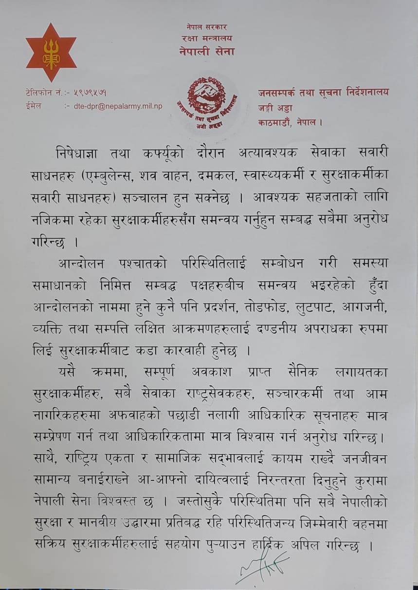 कर्फ्यु तथा निषेधाज्ञाको अवधिमा एम्बुलेन्स, शव वाहन, दमकल, स्वास्थ्यकर्मी, सुरक्षाकर्मीका सवारी साधन सञ्चालन हुने र आवश्यक सहजीकरणको लागि नजिकैका सुरक्षाकर्मीहरूसँग समन्वय गर्न सकिने सेनाले जनाएको छ ।