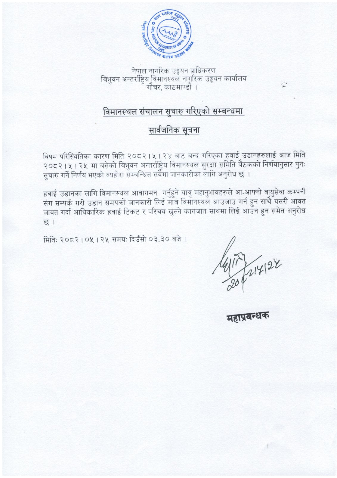 विमानस्थलको सार्वजनिक सूचनामा भनिएको छ, ‘हवाइ उडानका लागि विमानस्थल आवागमन गर्नुहुने यात्रु महानुभावहरुले आआफ्नो वायुसेवा कम्पनीसँग सम्पर्क गरी उडान समयको जानकारी लिई मात्र विमानस्थल आउजाउ गर्न हुन साथै यसरी आवतजावत गर्दाै आधिकारिक हवाई टिकट र परिचय खुल्ने कागजात साथमा लिई आउनुहुन समेत अनुरोध छ ।’