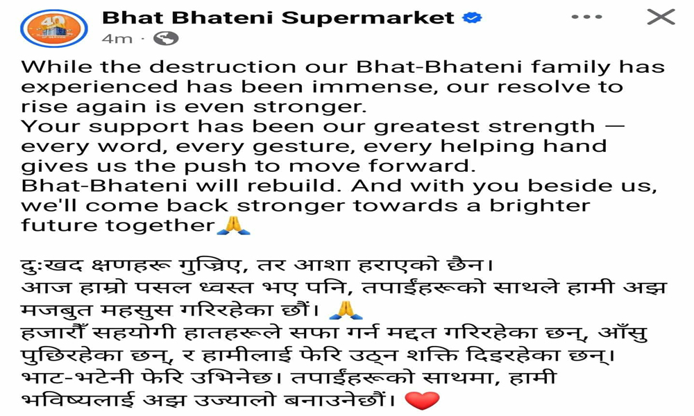 काठमाडौं । भाटभटेनी सुपरमार्केटले दुखद क्षणबाट गुज्रिएपनि अझै आशा नहराएको जनाएको छ । जेनजी आन्दोलनमा आन्दोलनकारीेले भाटभटेनीको विभिन्न शाखामा आगजनी, तोडफोड, लुटपाट मच्चाउँदा अर्बौंको क्षति भएको छ ।