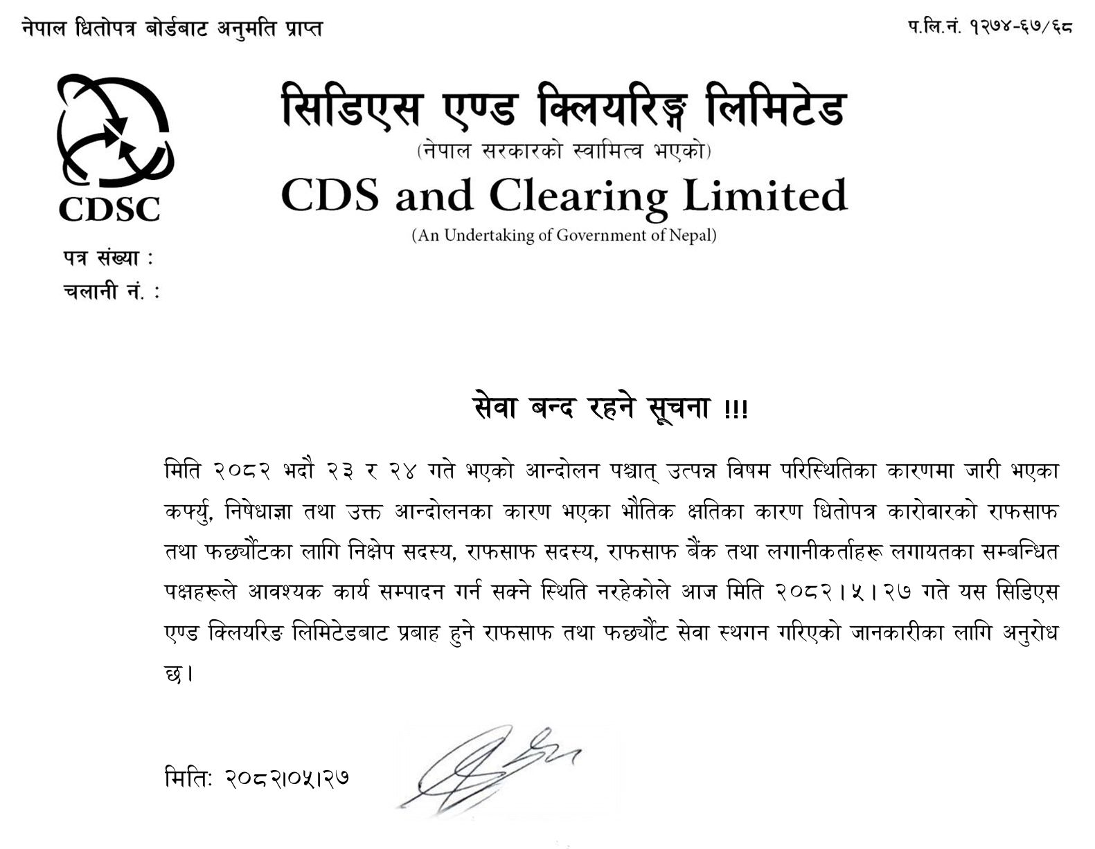 काठमाडौं । शुक्रबार सिडिएस एण्ड क्लियरिङ लिमिटेडबाट प्रवाह हुने राफसाफ तथा फर्छ्यौट सेवा स्थगन गरिएको छ । गत भदौ २३ र २४ गते भएको आन्दोलनपश्चात उत्पन्न विषम परिस्थितिका कारण जारी भएका कर्फ्यू, निषेधाज्ञा तथा उक्त आन्दोलनका कारण भएको भौतिक क्षतिका कारण धितोपत्र कारोबारको राफसाफ तथा फर्छ्यौटका लागि निक्षेप सदस्य, राफसाफ सदस्य, राफसाफ बैंक तथा लगानीकर्ताहरु लगायतका सम्बन्धित पक्षहरुले आवश्यक कार्य सम्पादन गर्न सक्ने स्थिति नरहेकोले आज सो सेवा स्थगन गरिएको बताइएको छ ।