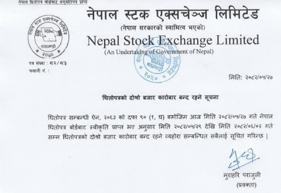 काठमाडौं । नेपाल स्टक एक्सचेञ्ज (नेप्से)ले असोज २ गते बिहीबारसम्म सेयर कारोबार बन्द गर्ने निर्णय गरेको छ । धितोपत्र सम्बन्धी ऐन, २०६३ को दफ ९०(१,घ) बमोजिम धितोपत्र बोर्डबाट स्वीकृति प्राप्त भए अनुसार असोज २ गते बिहीबारसम्म शेयर कारोबार बन्द गर्ने निर्णय गरेको हो ।