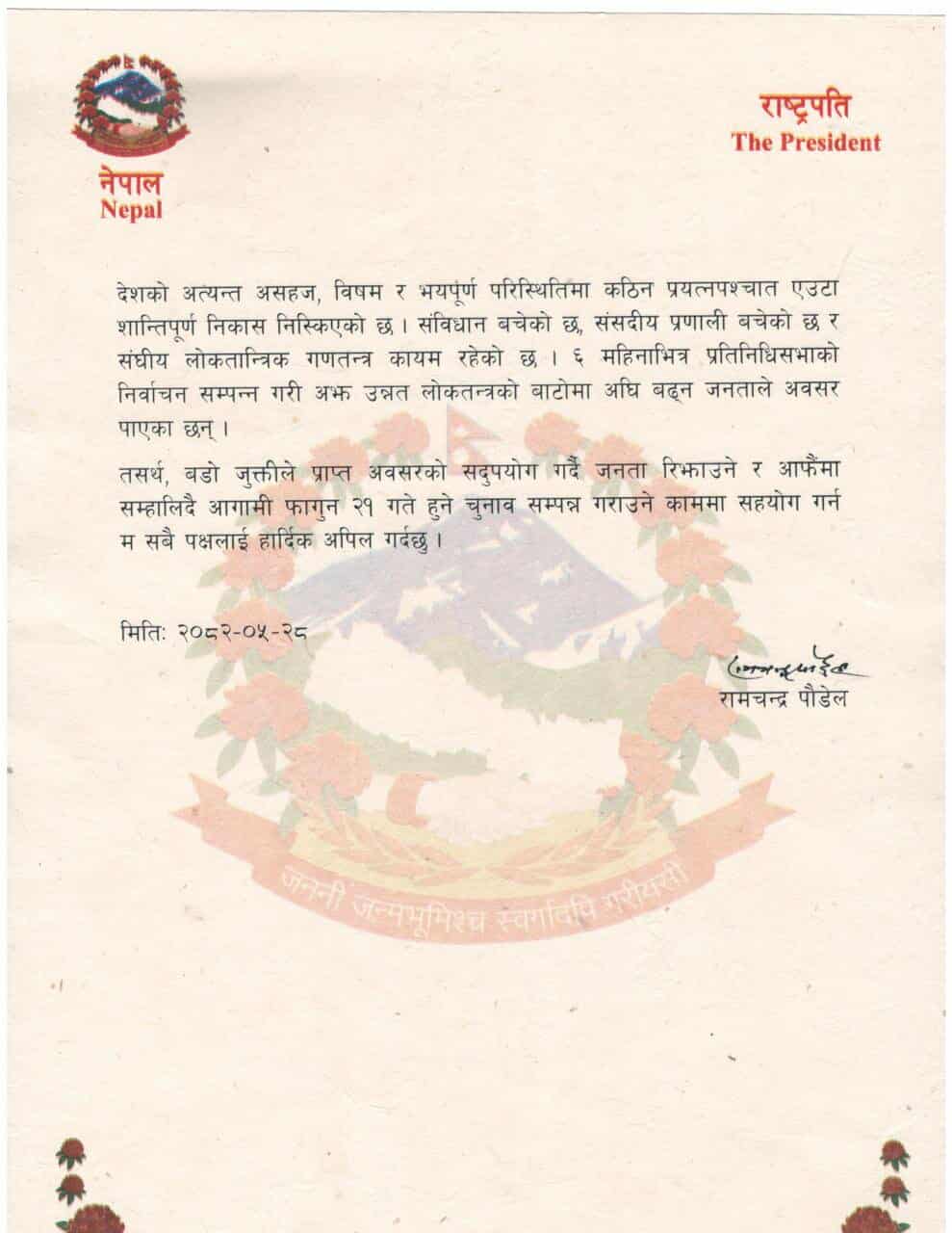 तर, शनिबार राष्ट्रपति पौडेलले परिस्थितिअनुरुप शान्तिपूर्ण निकास निस्किएको अवस्थामा प्रतिनिधि सभा विघटनको निर्णय स्वीकारेर निर्वाचन गराउन सबैलाई सहयोग गर्न अपील गरेका हुन् ।