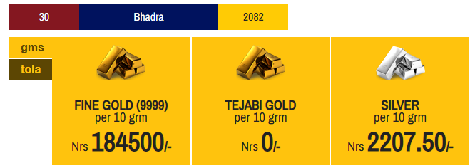काठमाडौं । सोमबार सुन र चाँदीको मूल्य बढेको छ । यस दिन सुनको मूल्य प्रतितोला १०० रुपैयाँले बढेको प्रतितोला २ लाख १५ हजार २०० रुपैयाँमा कारोबार भइरहेको नेपाल सुनचाँदी व्यवसायी महसंघले जनाएको छ । आइतबारको बजारमा छापावाला सुन प्रतितोला २ लाख १५ हजार १०० रुपैयाँमा कारोबार भएको थियो ।