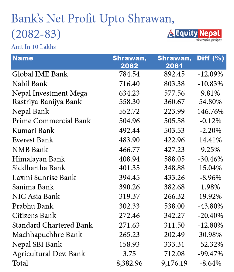 दोस्रोमा, नबिलले ७१ करोड ६४ लाख, नेपाल इन्भेष्टमेन्ट मेगाले ६३ करोड ४२ लाख रुपैयाँ नाफा कमाएका छन् । सबैभन्दा कम कृषि विकासले जम्मा ३७ लाख नाफा आर्जन गरेको छ । तथ्यांक अनुसार ६ वटा बैंकले ५० करोड भन्दा धेरै नाफा कमाएका छन् । २० मध्ये ११ वटाको नाफा गत वर्षको भन्दा कम छ ।