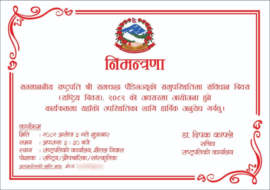 संविधान दिवस (राष्ट्रिय दिवस) को अवसरमा राष्ट्रपतिको कार्यालय शीतल निवासमा कार्यक्रम राखेका छन् । उपस्थितिका लागि राष्ट्रपति पौडेलले विशिष्ठ व्यक्तिहरूलाई आमन्त्रण गरेका छन् ।