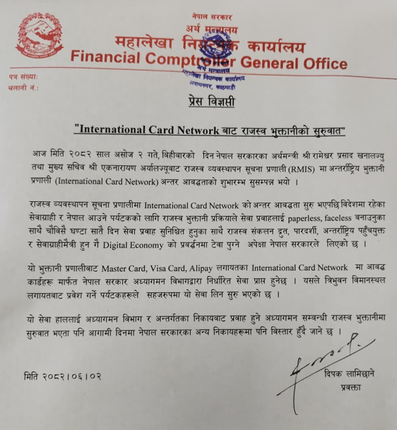 सोसँगै विदेशमा रहेका सेवाग्राही र नेपाल आउने पर्यटकको लागि राजस्व भुक्तानी प्रक्रिया सहज भएको छ । यो भुक्तानी प्रणालीबाट Master Card, Visa Card, Alipay लगायतका अन्तर्राष्ट्रिय कार्ड नेटवर्कमा आबद्ध कार्डहरु मार्फत नेपाल सरकार अध्यागमन विभागद्वारा निर्धारित सेवा प्राप्त हुने जनाइएको छ ।